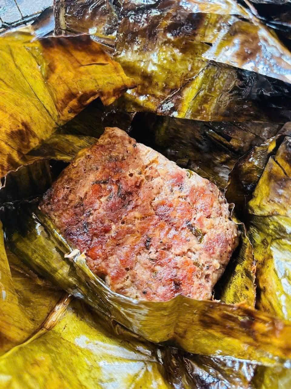 Thịt lợn băm nhuyễn gói lá rừng nướng than, thơm mùi lá đặc trưng