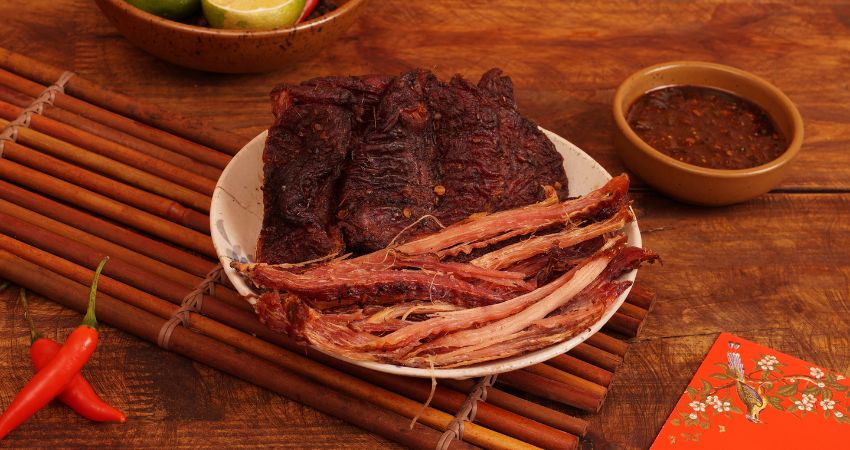Thịt trâu gác bếp là linh hồn của bếp Thái Tây Bắc. Thịt trâu tươi được ướp muối, ớt rừng và mắc khén rồi treo lên gác bếp hun khói nhiều ngày – cách bảo quản thịt qua mùa đông từ hàng trăm năm trước. Vị đậm đà, dai ngon, thơm khói nhẹ. Kết hợp với rượu cần là chuẩn vị nhất.